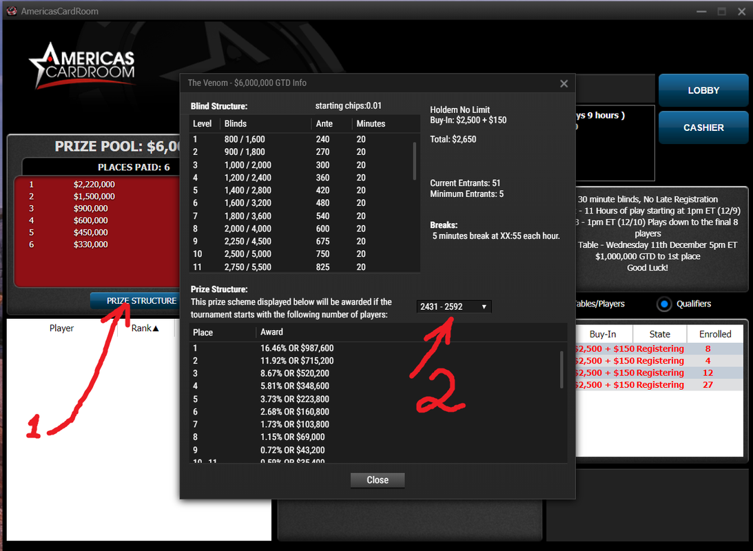 Now go to the ACR lobby, and find the Day 1's listed under that you will see the day 2 listed, open the Day 2 lobby (it has date of Mon09 Dec, 2019) after you open the lobby Click on the blue "PRIZE STRUCTURE" button.... A popup window will open about half way down and right of center you will see a small window where number of players will go, click on that and a dropdown menu appears scroll down and click on 2431-2592 because 2,553 entries of last venom falls in that range. After you click on that the payouts will be listed at the bottom of the same window. The 1st place is wrong because 1st is 1 million guaranteed but other than that should be close.
