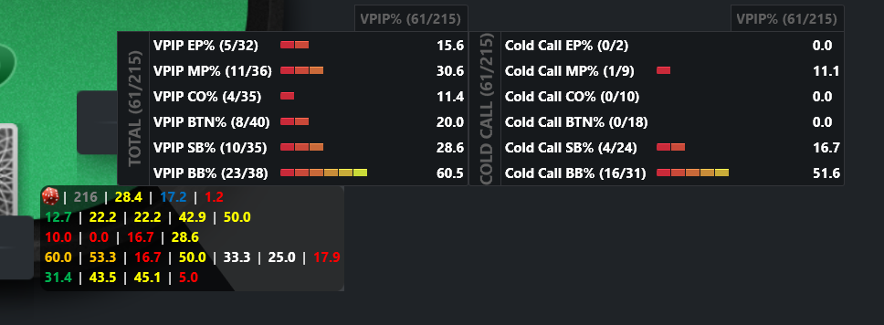 Villain is a fairly loose BB defender with a 51.6% cold call BB stat.