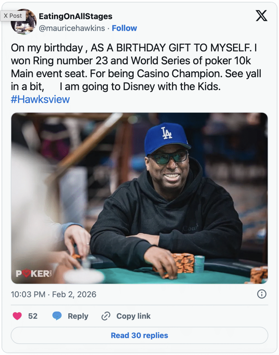 Maurice Hawkins pulled out his Micheal Jordan gear to celebrate winning his 23rd World Series of Poker Circuit ring, just a few days after he won his 22nd.