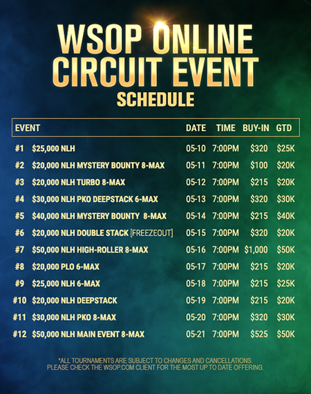 - May 21, 5 p.m.: $525 No-limit Hold’em Main Event, $300,000 GTD