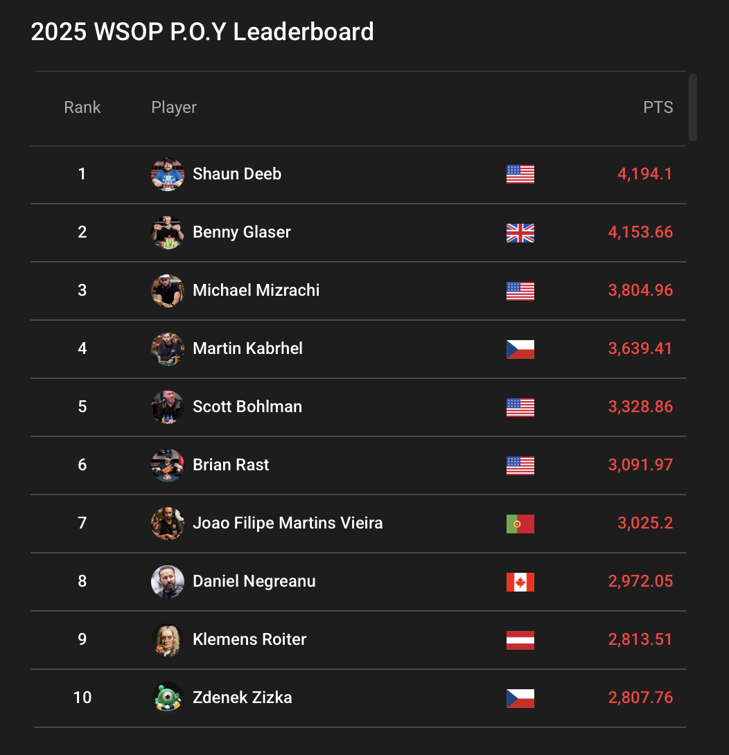 After all the dust settled, it’s Shaun Deeb who is the 2025 World Series of Poker Player of the Year. Deeb, who also won the honor in 2018, joins Daniel Negreanu as the only player to win the WSOP Player of the Year twice (2004, 2013).