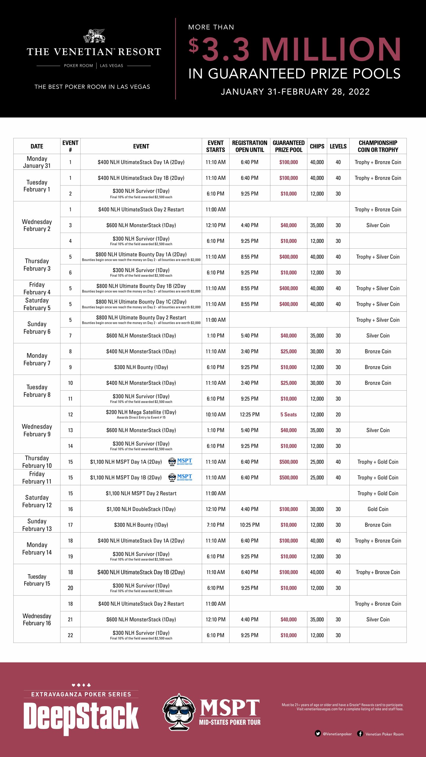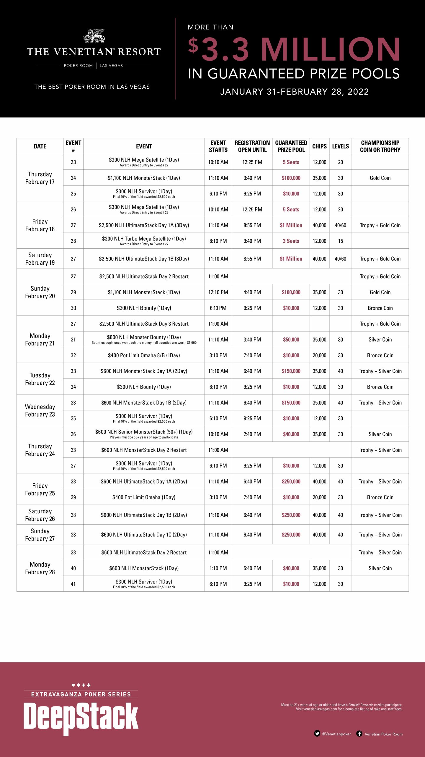 The series will run from Jan. 31 to Feb. 28 and features $400 and $600 buy-ins on most weekdays, with smaller $300 events at 6:10 pm on most nights. There are some nice guarantees, including a $1 million guarantee for the $2,500 Ultimate Stack. The full schedule PDF and structure sheets are available here.