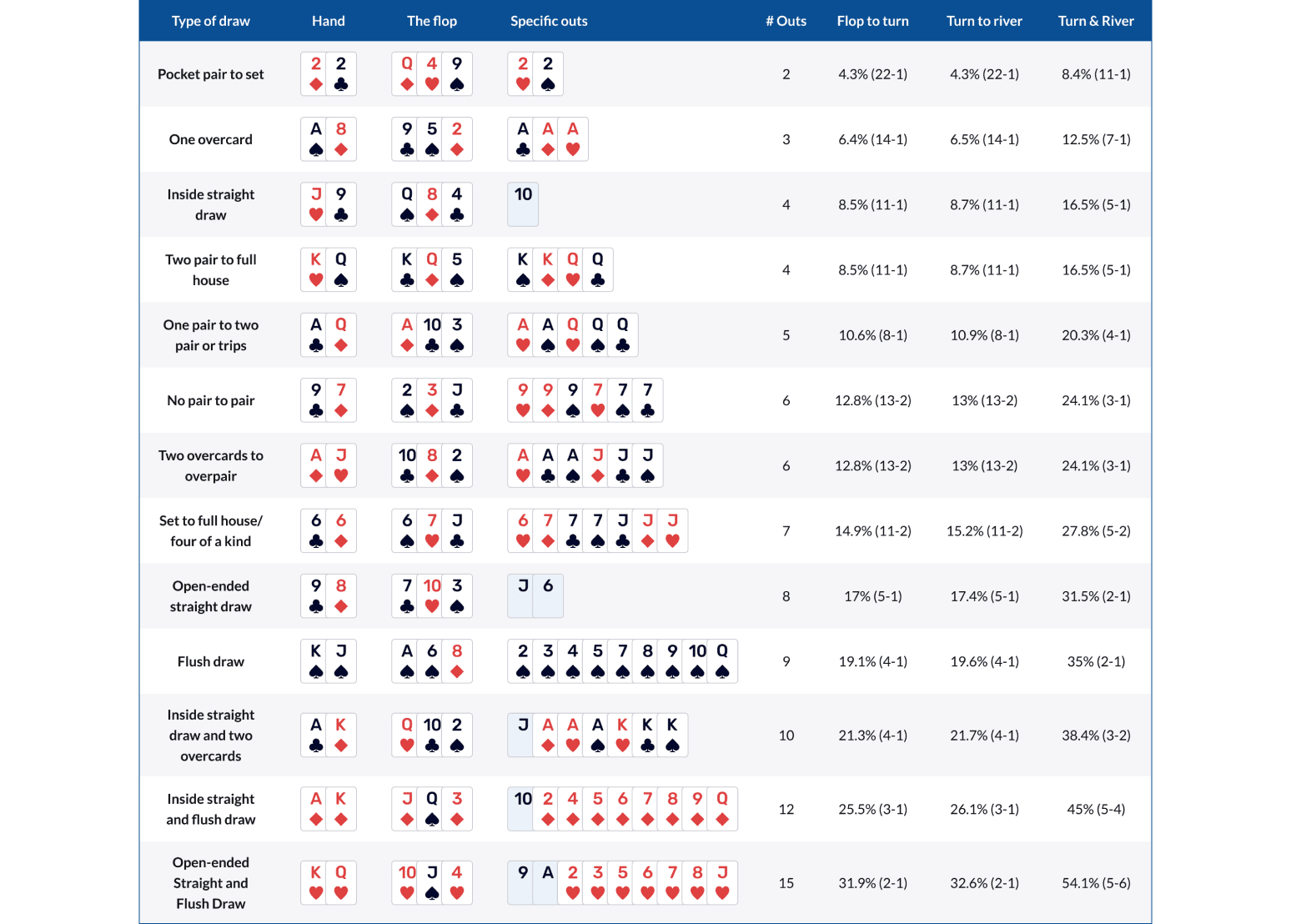 Our poker odds cheat sheets can give you the edge at the tables and help you make better decisions – especially when you have a drawing hand. Click to download and print them out (or simply bookmark this page) so you always have them handy.